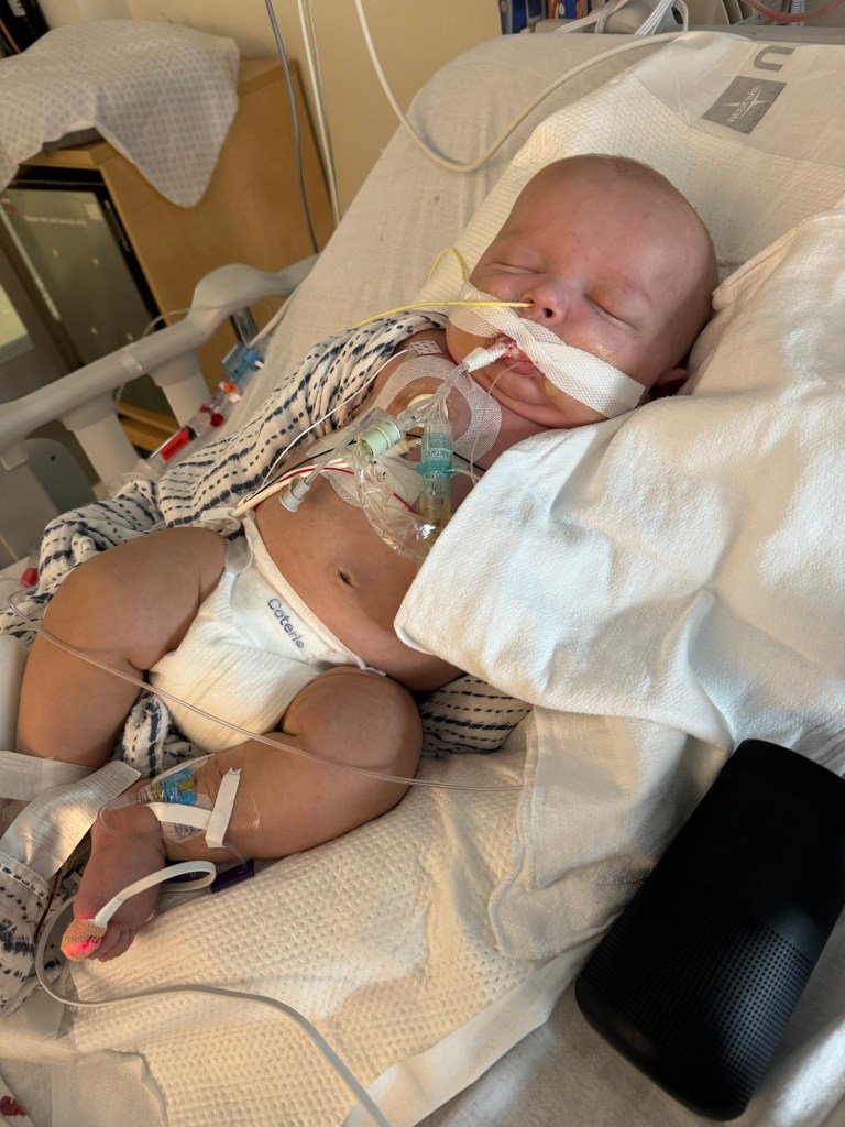 While the news of Theo’s engraftment was wonderful, his body is struggling to recover from the transplant process. One Sunday night, he was intubated because his lungs couldn’t keep up and his oxygen levels were not in safe ranges. He is also currently fluid overloaded and has not responded to diuretics as hoped, so we are moving to dialysis. In a baby, dialysis requires a small procedure to place the line, which will happen this afternoon. We are hopeful that being able to control his fluid levels will turn the tide and get him back on the road to recovery.